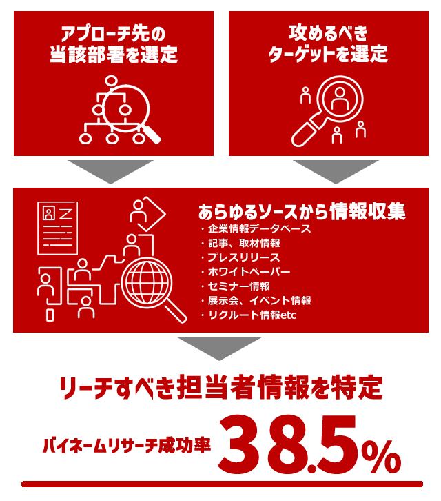 そのような中、当社はバイネーム(指名)調査を実施し、法人向けのサービスを展開している企業様が決裁担当者様へダイレクトにアクセスできるよう、バイネームリストをご提供いたします。